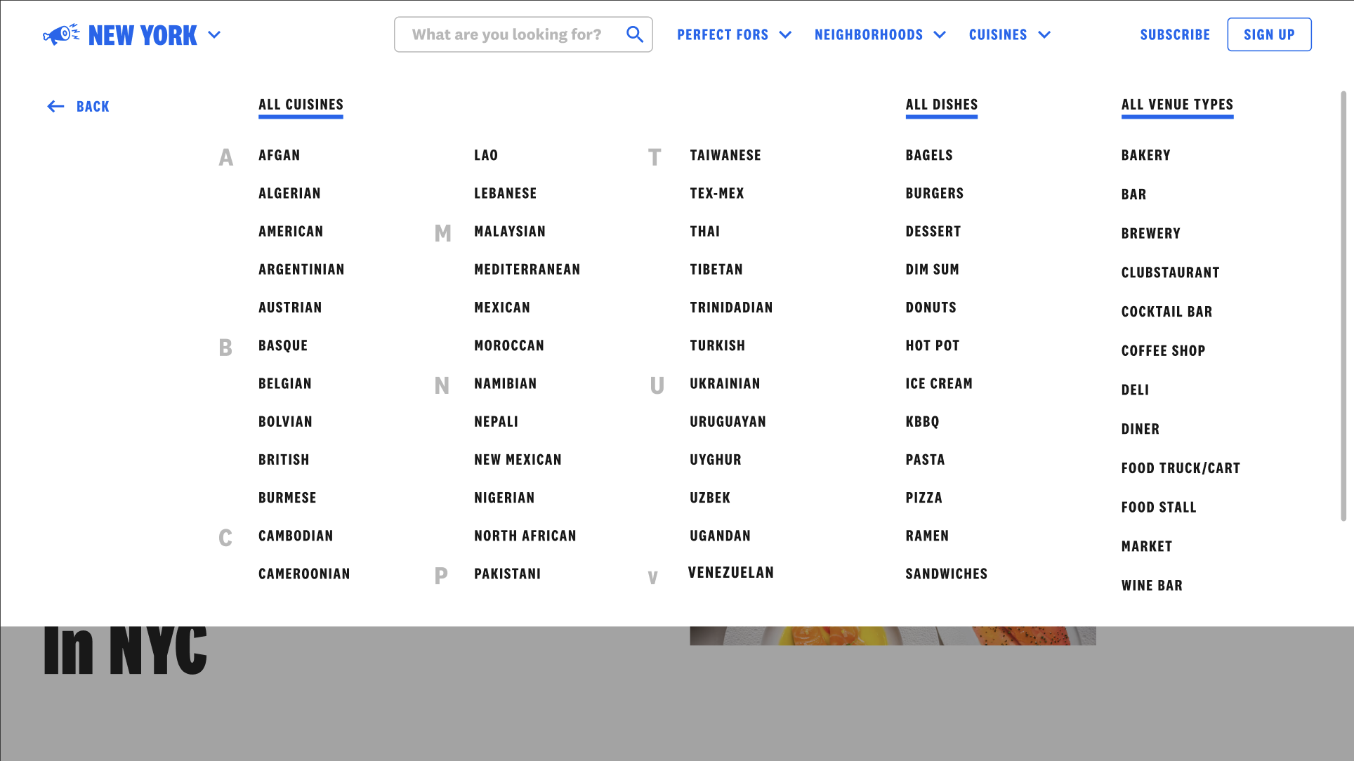 After a user clicks “View All” on the first tier, they are taken to this alphabetical menu where they can see every type of cuisine, dish, and venue type. The menu scrolls down so we can fit them all without taking readers off the page.